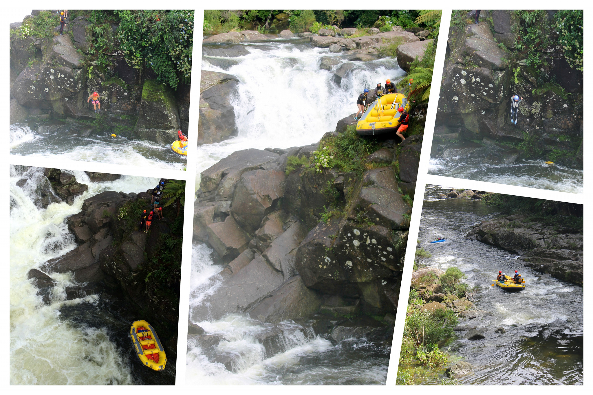 McLaren Falls: Wildwasser-Rafting und ein unglaublicher Start! Erst wird das Raft vom Felsen geschmissen, dann muss jeder Teilnehmer hinterher springen. Wie cool ist das denn!